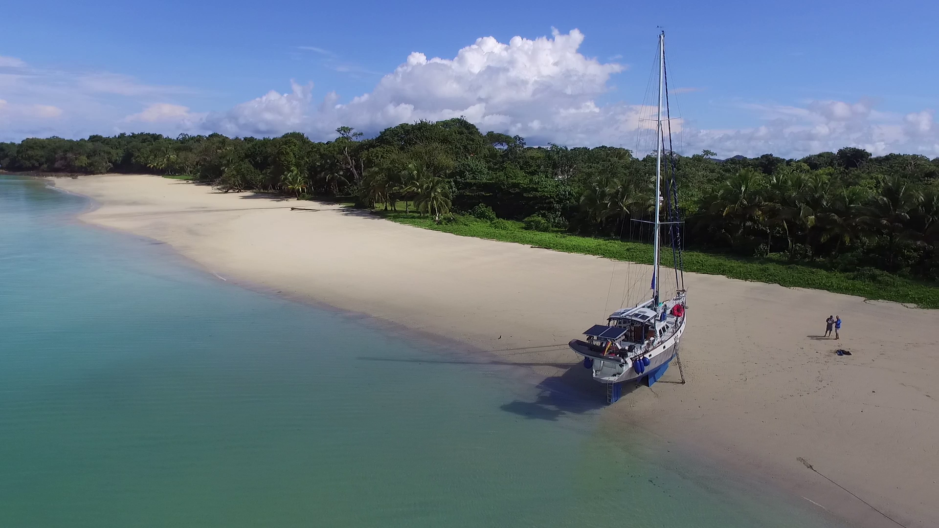 De Kobel, een Duitse boot, die gelijk met ons vertrekt naar de Galapagos heeft een maand geleden de boot uit het water gehaald in Shelter Bay (andere zijde van het Panamakanaal) en heeft een nieuwe laag antifouling aangebracht. Voor de zekerheid laat hij zijn boot op de Perlas eilanden droog vallen, dit is mogelijk aangezien zij een kimkieler hebben. Op het strand bij laag water wordt de nieuwe laag antifouling nogmaals schoon gemaakt. voor hun erg spannend, want het was de eerste keer dat zij de boot droog laten vallen. We maken een paar rondjes met de drone en dit levert een aantal spectaculaire mooie foto's op.